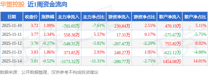 资金流向数据方面,本周华塑控股主力资金合计净流出1490.49万元,游资资金合计净流入8.18万元,散户资金合计净流入1482.31万元。本周资金流向一览见下表: