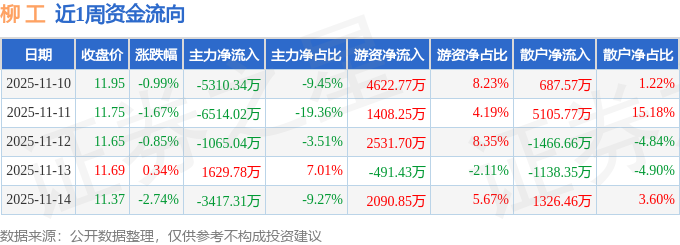 资金流向数据方面,本周柳 工主力资金合计净流出1.47亿元,游资资金合计净流入1.02亿元,散户资金合计净流入4514.8万元。本周资金流向一览见下表: