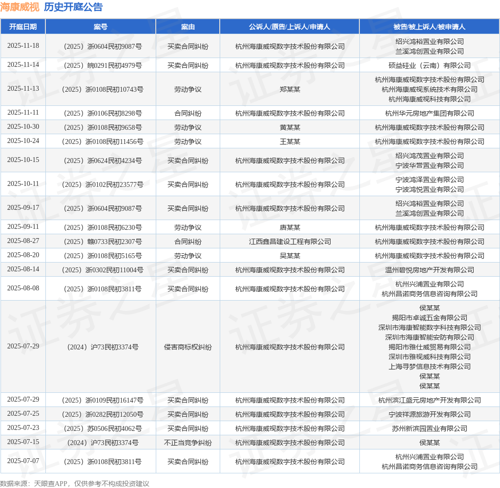 案号:(2025)浙0604民初9087号根据统计,近一年内以杭州海康威视数字技术股份有限公司为当事人的历史开庭公告有60则,其中案由为“买卖合同纠纷”的公告以45则居首,其次为“劳动争议”有5则,“合同纠纷”有4则。历史开庭公告(前20条)如下: