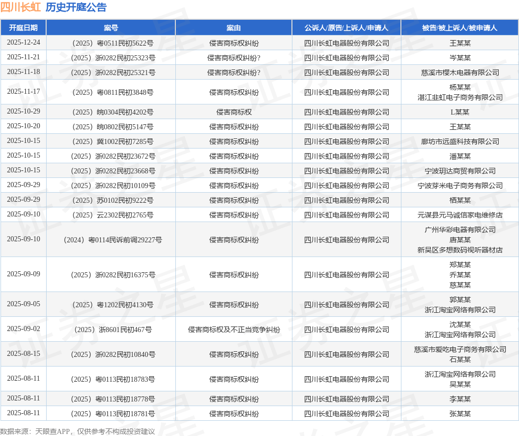案号:(2025)浙0282民初25321号根据统计,近一年内以四川长虹电器股份有限公司为当事人的历史开庭公告有86则,其中案由为“侵害商标权纠纷”的公告以59则居首,其次为“劳动争议”有10则,“劳动合同纠纷”有4则。历史开庭公告(前20条)如下: