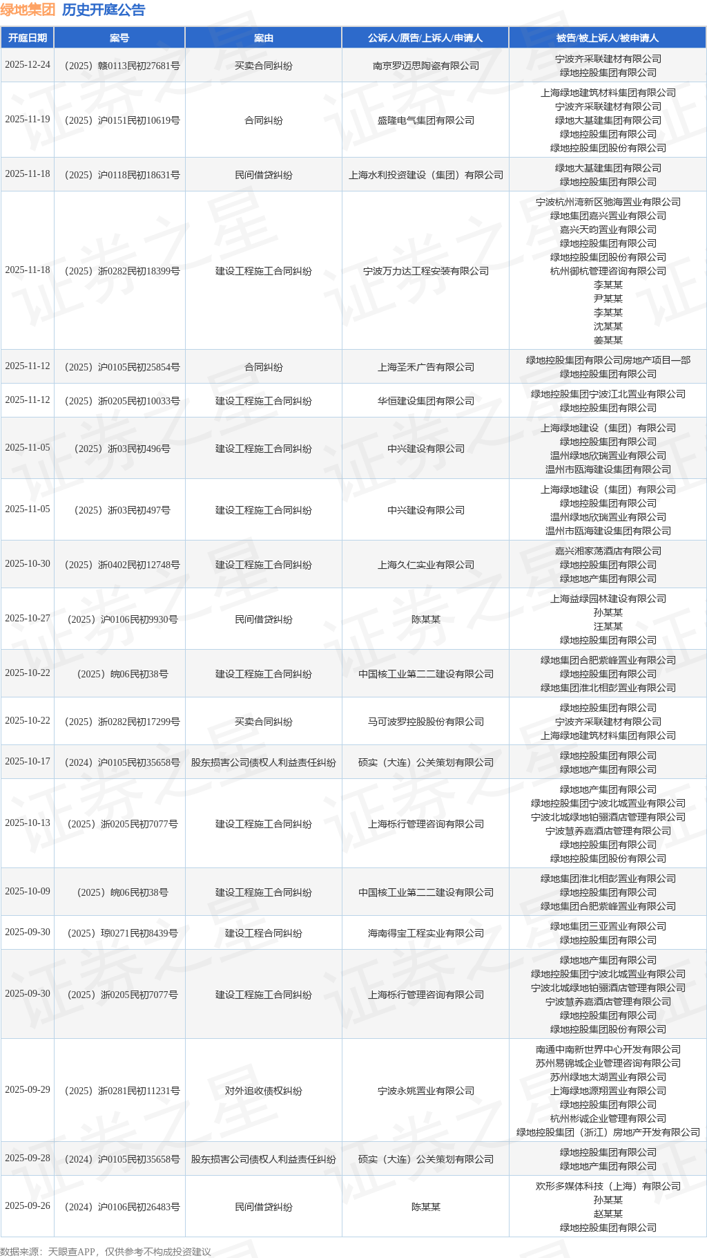案号:(2025)沪0118民初18631号根据统计,近一年内以绿地控股集团有限公司为当事人的历史开庭公告有199则,其中案由为“建设工程施工合同纠纷”的公告以38则居首,其次为“金融借款合同纠纷”有24则,“合同纠纷”有19则。历史开庭公告(前20条)如下: