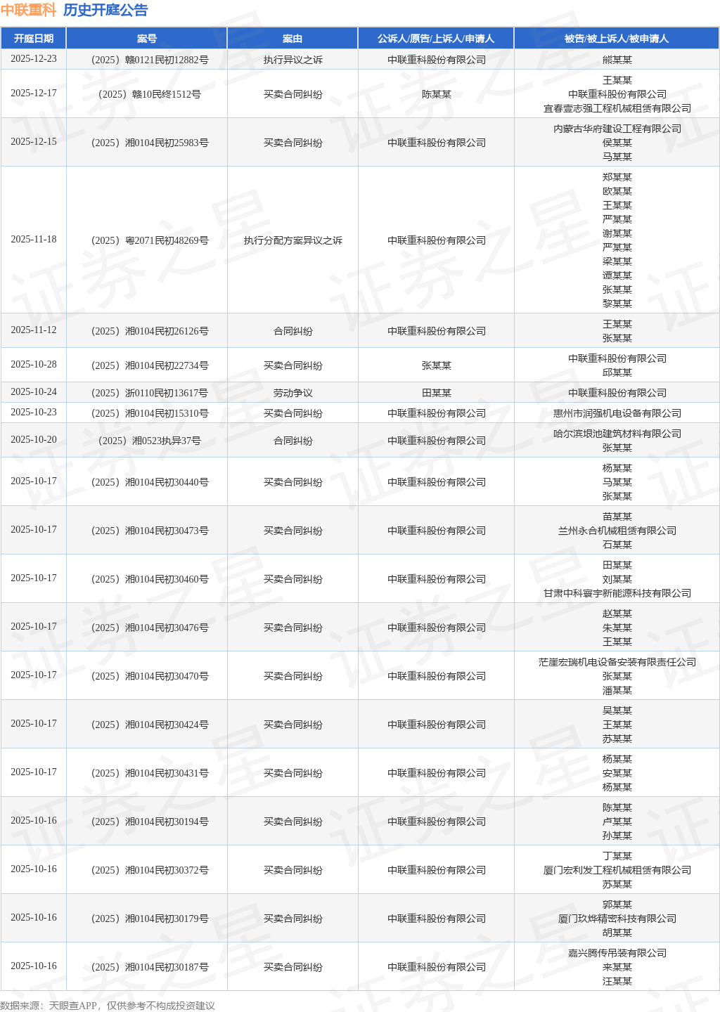 案号:(2025)粤2071民初48269号根据统计,近一年内以中联重科股份有限公司为当事人的历史开庭公告有147则,其中案由为“买卖合同纠纷”的公告以89则居首,其次为“侵权责任纠纷”有8则,“追偿权纠纷”有6则。历史开庭公告(前20条)如下:
