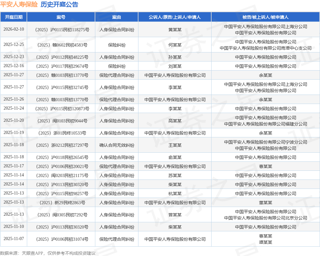 案号:(2025)沪0118民初26545号根据统计,近一年内以中国平安人寿保险股份有限公司为当事人的历史开庭公告有410则,其中案由为“人身保险合同纠纷”的公告以242则居首,其次为“保险纠纷”有41则,“保险代理合同纠纷”有37则。历史开庭公告(前20条)如下: