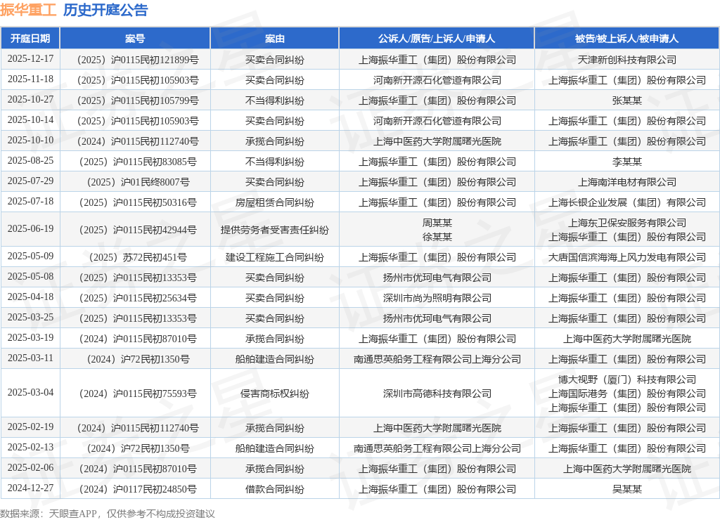 案号:(2025)沪0115民初105903号根据统计,近一年内以上海振华重工(集团)股份有限公司为当事人的历史开庭公告有25则,其中案由为“买卖合同纠纷”的公告以8则居首,其次为“承揽合同纠纷”有5则,“船舶建造合同纠纷”有3则。历史开庭公告(前20条)如下: