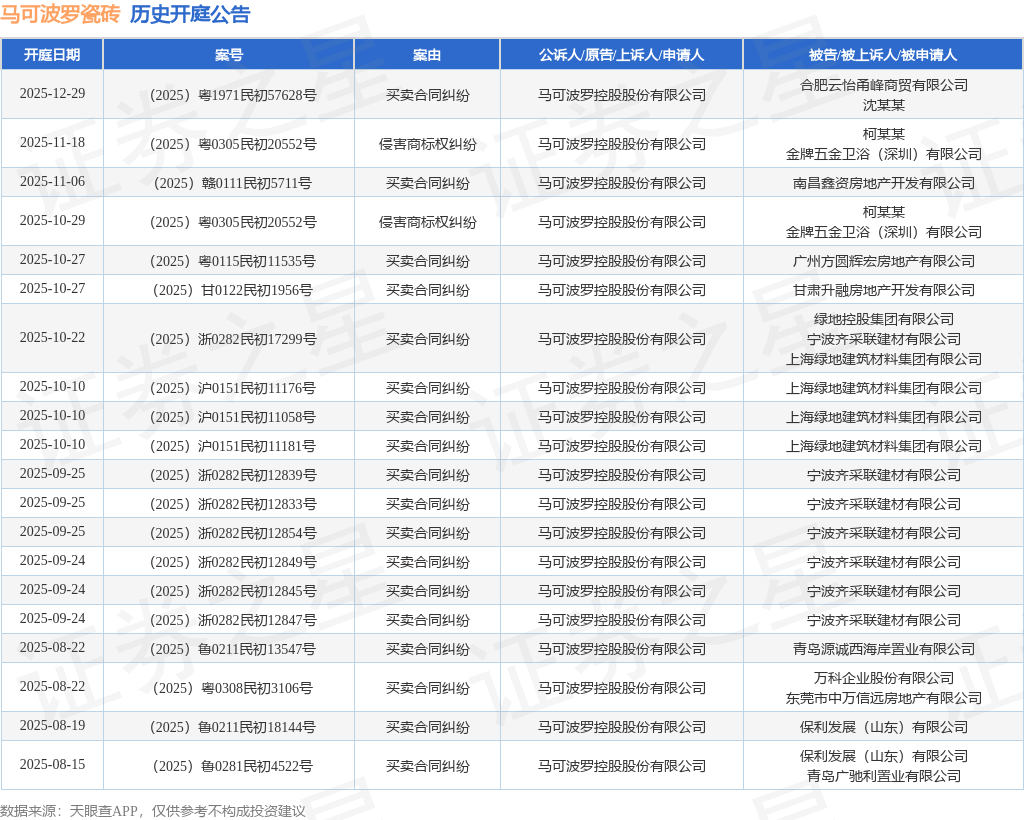 案号:(2025)粤0305民初20552号根据统计,近一年内以马可波罗控股股份有限公司为当事人的历史开庭公告有53则,其中案由为“买卖合同纠纷”的公告以45则居首,其次为“侵害商标权纠纷”有5则,“合同纠纷”有3则。历史开庭公告(前20条)如下: