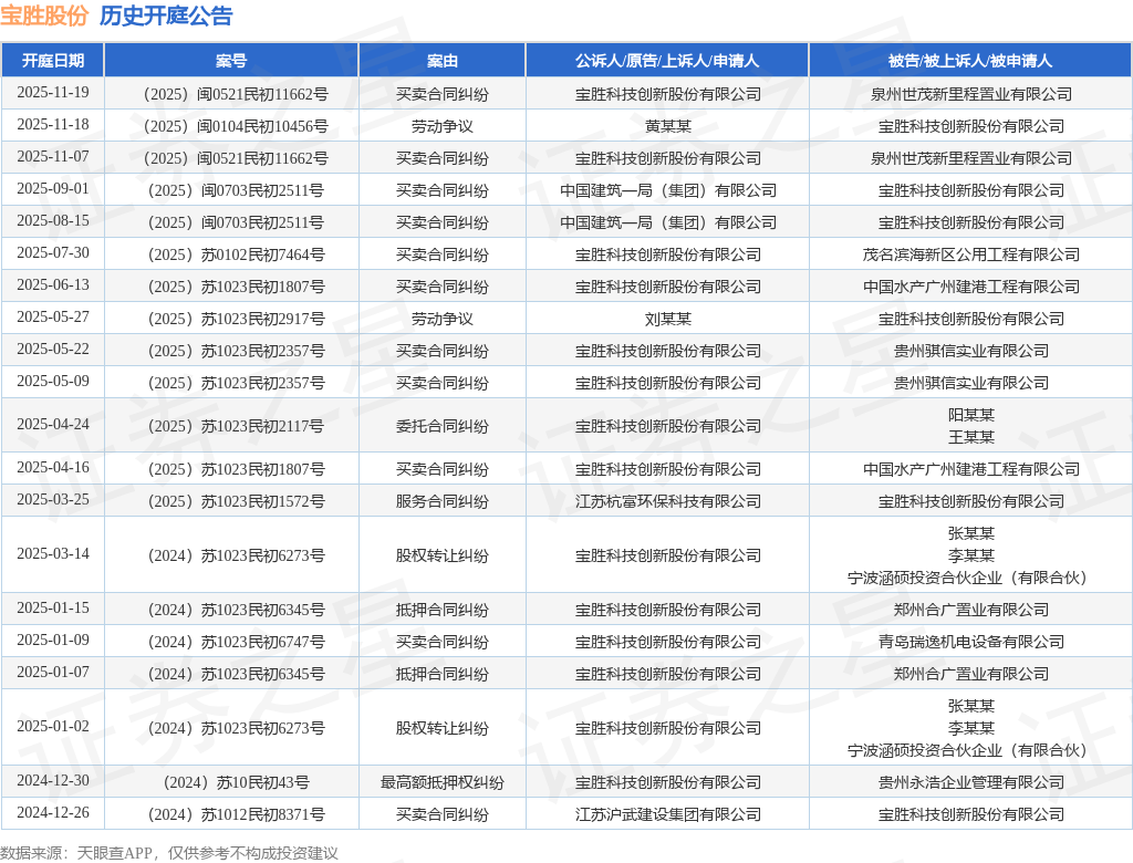 案号:(2025)闽0104民初10456号根据统计,近一年内以宝胜科技创新股份有限公司为当事人的历史开庭公告有29则,其中案由为“买卖合同纠纷”的公告以14则居首,其次为“劳动争议”有4则,“抵押合同纠纷”有4则。历史开庭公告(前20条)如下: