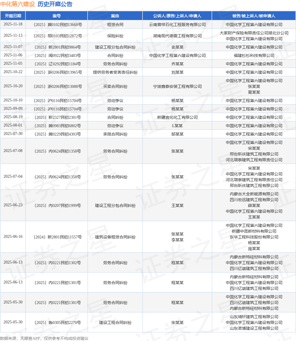 案号:(2025)冀0102民初13668号根据统计,近一年内以中国化学工程第六建设有限公司为当事人的历史开庭公告有81则,其中案由为“劳务合同纠纷”的公告以28则居首,其次为“建设工程施工合同纠纷”有12则,“劳动争议”有8则。历史开庭公告(前20条)如下: