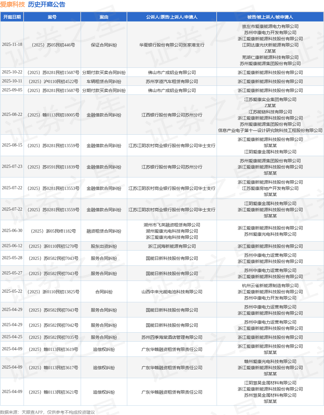 案号:(2025)苏05民初446号根据统计,近一年内以浙江爱康新能源科技股份有限公司为当事人的历史开庭公告有45则,其中案由为“金融借款合同纠纷”的公告以14则居首,其次为“追偿权纠纷”有9则,“服务合同纠纷”有6则。历史开庭公告(前20条)如下:
