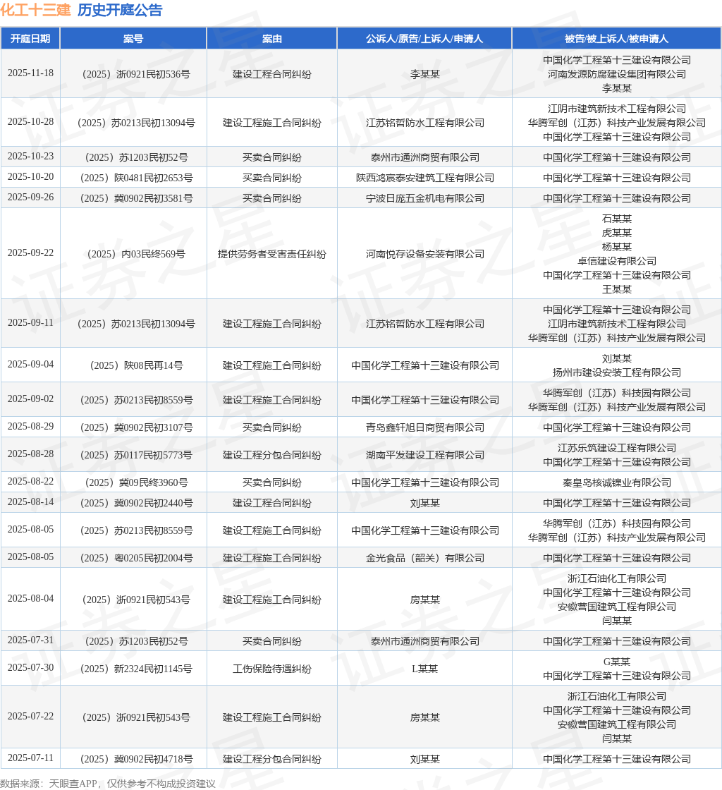 案号:(2025)浙0921民初536号根据统计,近一年内以中国化学工程第十三建设有限公司为当事人的历史开庭公告有72则,其中案由为“建设工程施工合同纠纷”的公告以22则居首,其次为“建设工程分包合同纠纷”有11则,“买卖合同纠纷”有8则。历史开庭公告(前20条)如下: