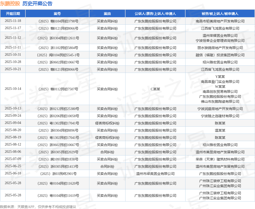 案号:(2025)赣0104民初3798号根据统计,近一年内以广东东鹏控股股份有限公司为当事人的历史开庭公告有78则,其中案由为“买卖合同纠纷”的公告以64则居首,其次为“合同纠纷”有6则,“侵害商标权纠纷”有5则。历史开庭公告(前20条)如下: