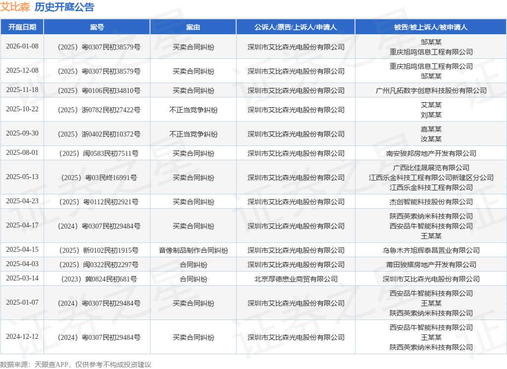 案号:(2025)粤0106民初34810号根据统计,近一年内以深圳市艾比森光电股份有限公司为当事人的历史开庭公告有14则,其中案由为“买卖合同纠纷”的公告以9则居首,其次为“不正当竞争纠纷”有2则,“合同纠纷”有2则。历史开庭公告如下: