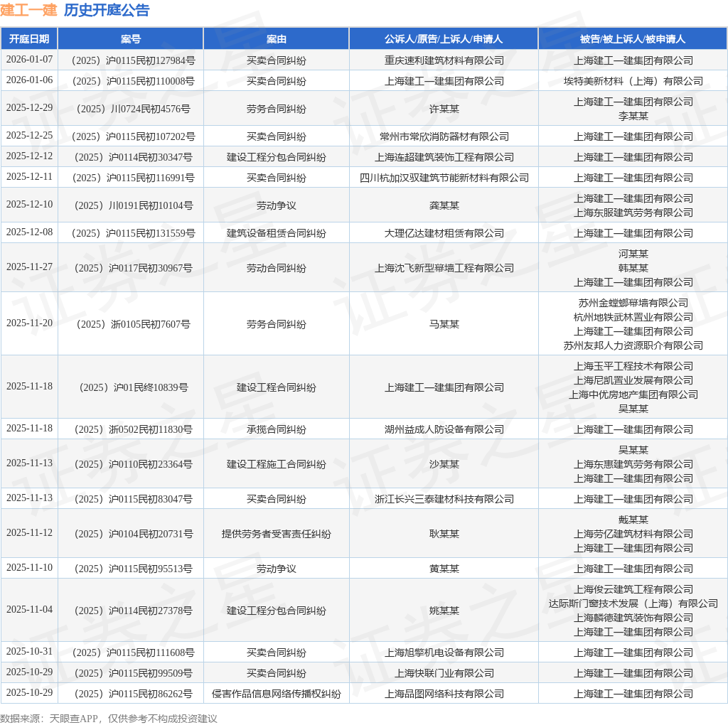 案号:(2025)浙0502民初11830号根据统计,近一年内以上海建工一建集团有限公司为当事人的历史开庭公告有324则,其中案由为“买卖合同纠纷”的公告以80则居首,其次为“建设工程施工合同纠纷”有44则,“建设工程分包合同纠纷”有41则。历史开庭公告(前20条)如下: