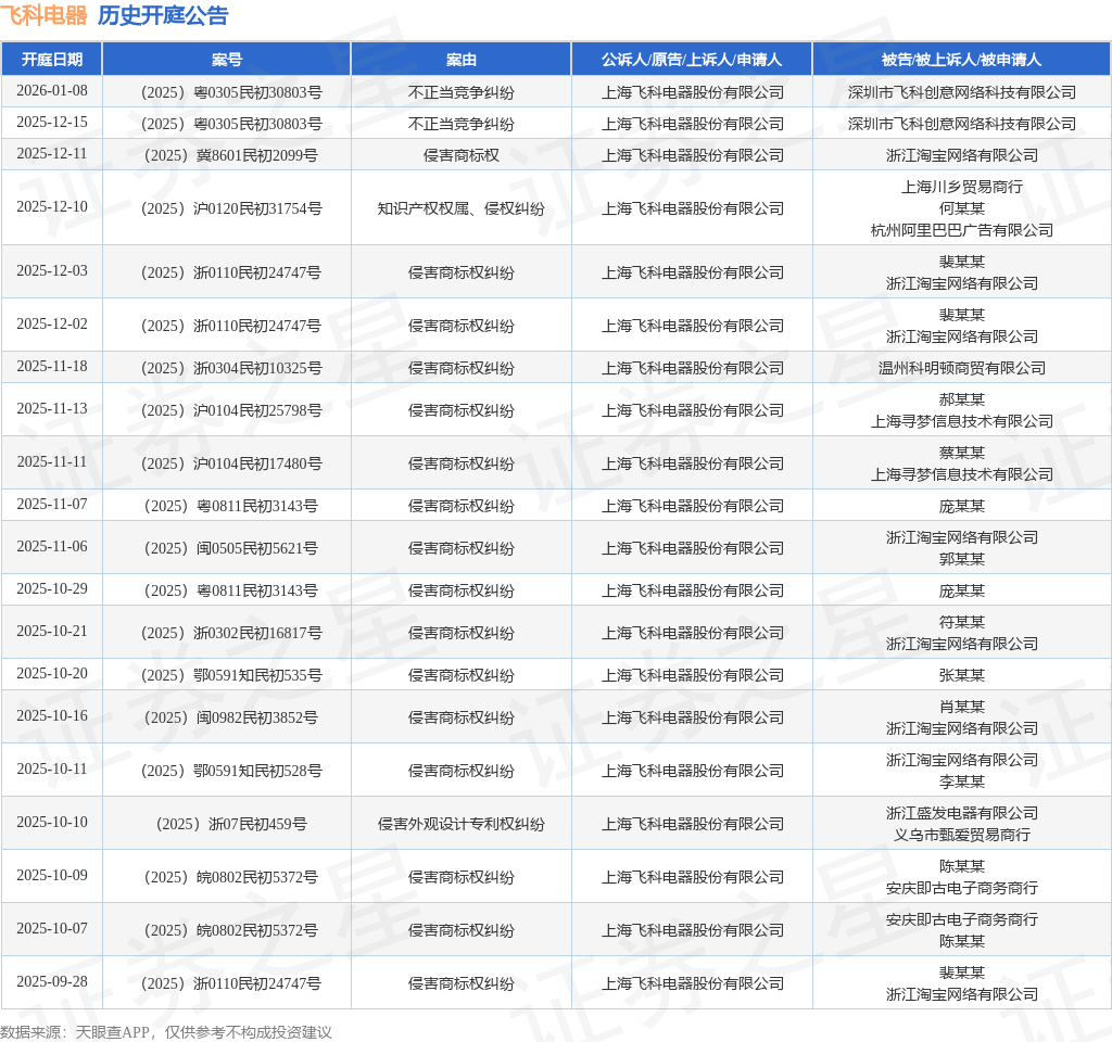 案号:(2025)浙0304民初10325号根据统计,近一年内以上海飞科电器股份有限公司为当事人的历史开庭公告有270则,其中案由为“侵害商标权纠纷”的公告以205则居首,其次为“不正当竞争纠纷”有19则,“侵害外观设计专利权纠纷”有12则。历史开庭公告(前20条)如下: