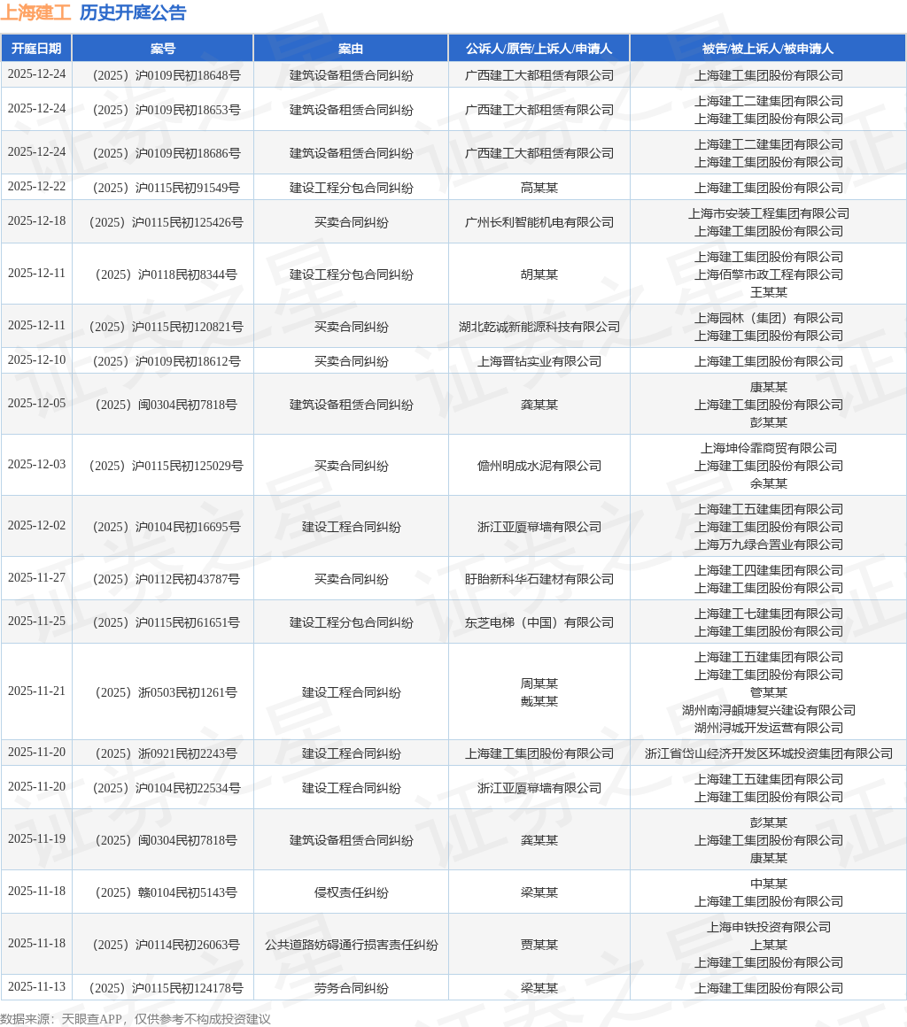 案号:(2025)沪0114民初26063号根据统计,近一年内以上海建工集团股份有限公司为当事人的历史开庭公告有441则,其中案由为“买卖合同纠纷”的公告以110则居首,其次为“建设工程施工合同纠纷”有89则,“建设工程分包合同纠纷”有45则。历史开庭公告(前20条)如下: