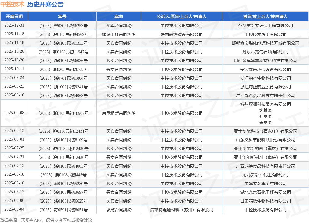 案号:(2025)浙0108民初1333号根据统计,近一年内以中控技术股份有限公司为当事人的历史开庭公告有41则,其中案由为“买卖合同纠纷”的公告以34则居首,其次为“承揽合同纠纷”有3则,“劳动争议”有1则。历史开庭公告(前20条)如下: