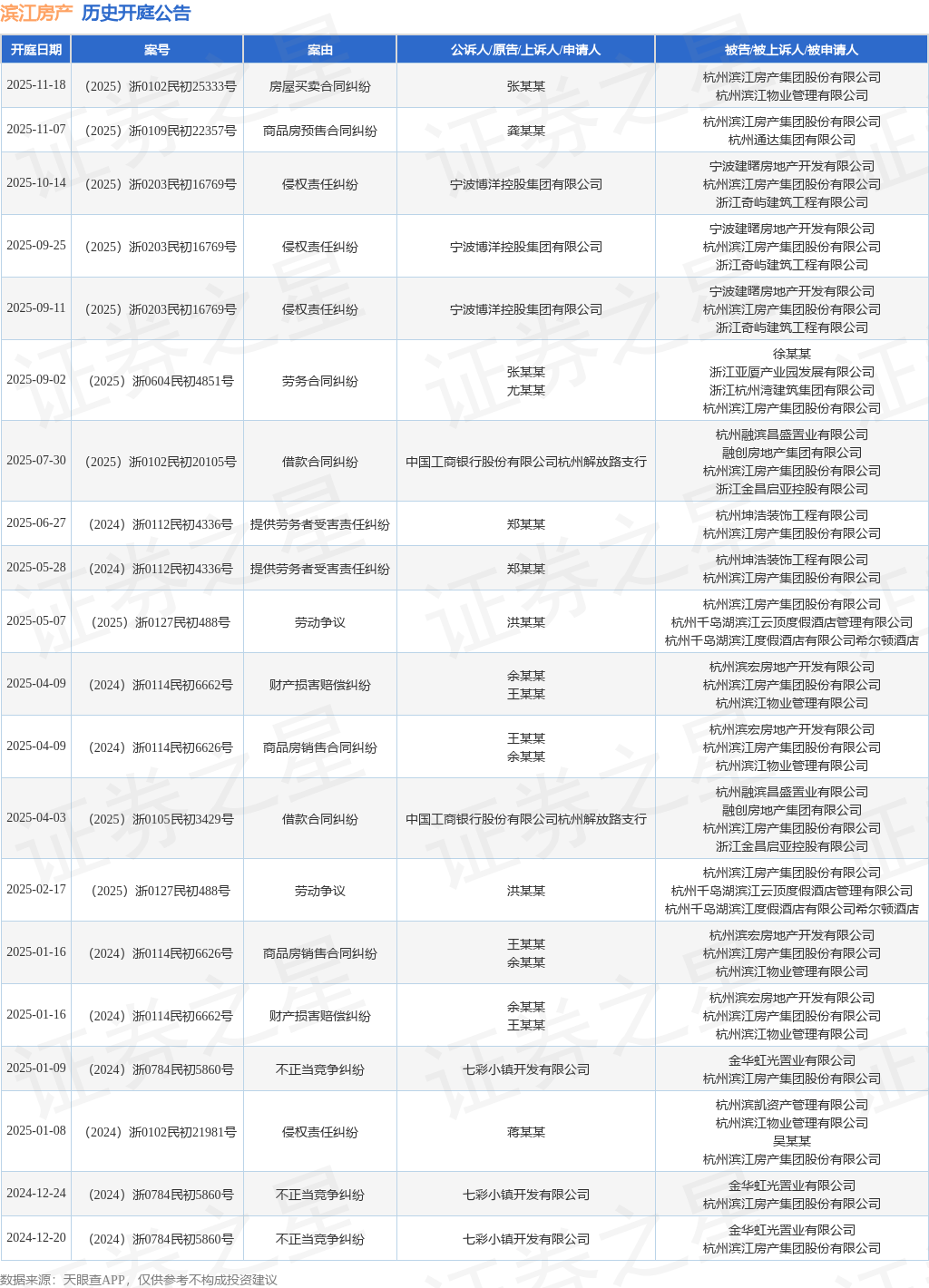 案号:(2025)浙0102民初25333号根据统计,近一年内以杭州滨江房产集团股份有限公司为当事人的历史开庭公告有20则,其中案由为“侵权责任纠纷”的公告以4则居首,其次为“不正当竞争纠纷”有3则,“借款合同纠纷”有2则。历史开庭公告如下: