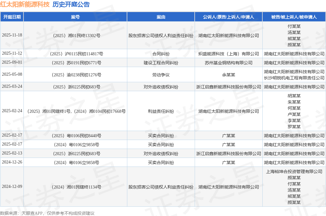 案号:(2025)湘01民终13302号根据统计,近一年内以湖南红太阳新能源科技有限公司为当事人的历史开庭公告有11则,其中案由为“买卖合同纠纷”的公告以3则居首,其次为“对外追收债权纠纷”有2则,“股东损害公司债权人利益责任纠纷”有2则。历史开庭公告如下:
