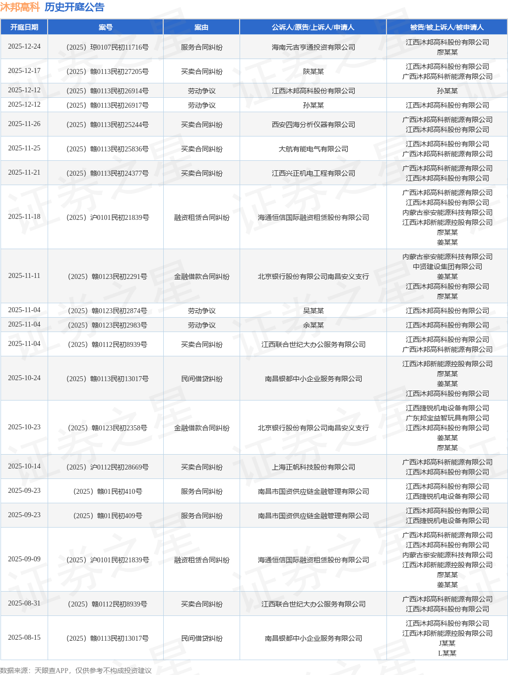 案号:(2025)沪0101民初21839号根据统计,近一年内以江西沐邦高科股份有限公司为当事人的历史开庭公告有38则,其中案由为“买卖合同纠纷”的公告以10则居首,其次为“票据追索权纠纷”有8则,“劳动争议”有4则。历史开庭公告(前20条)如下: