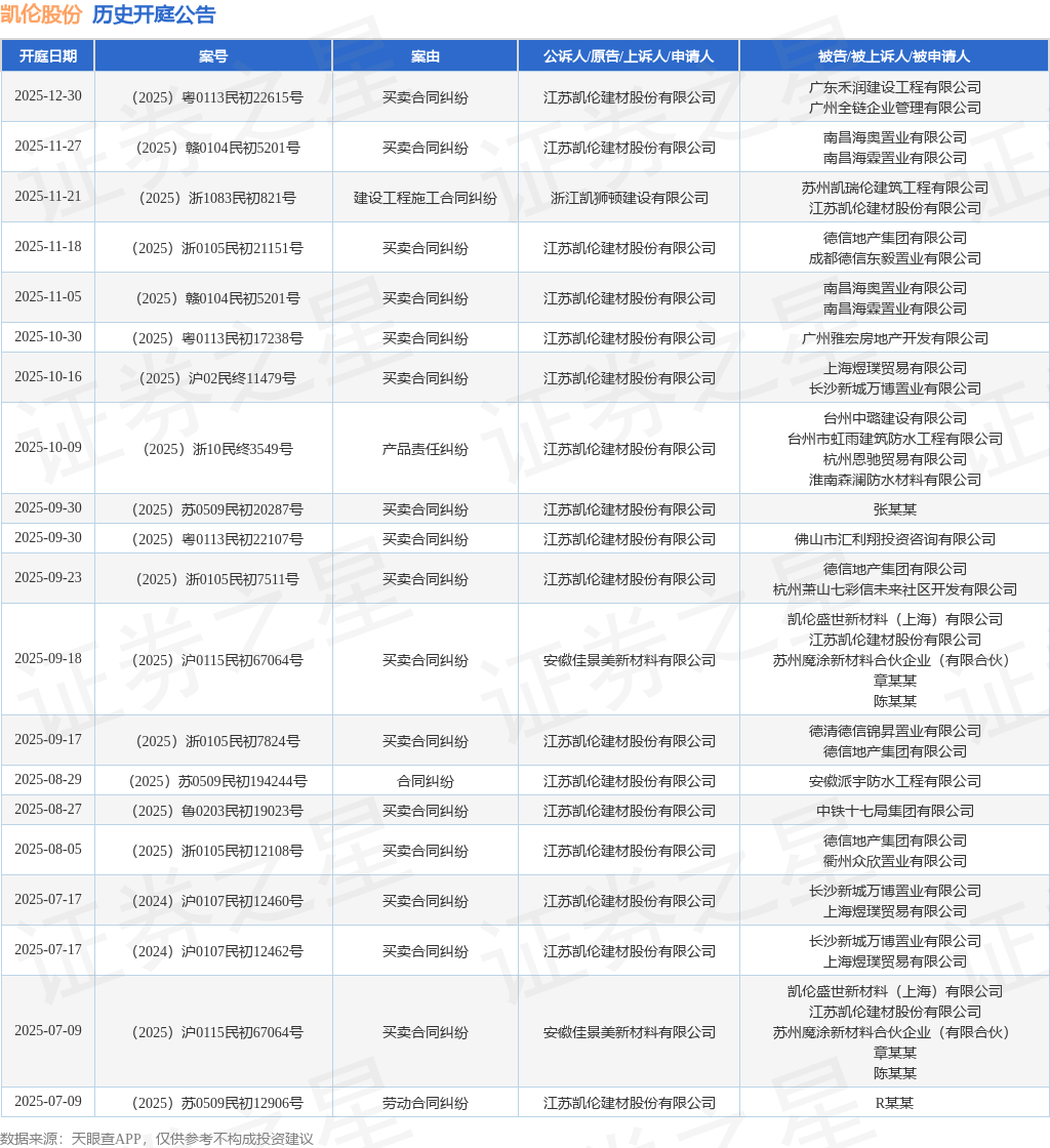 案号:(2025)浙0105民初21151号根据统计,近一年内以江苏凯伦建材股份有限公司为当事人的历史开庭公告有85则,其中案由为“买卖合同纠纷”的公告以67则居首,其次为“劳动合同纠纷”有8则,“合同纠纷”有4则。历史开庭公告(前20条)如下:
