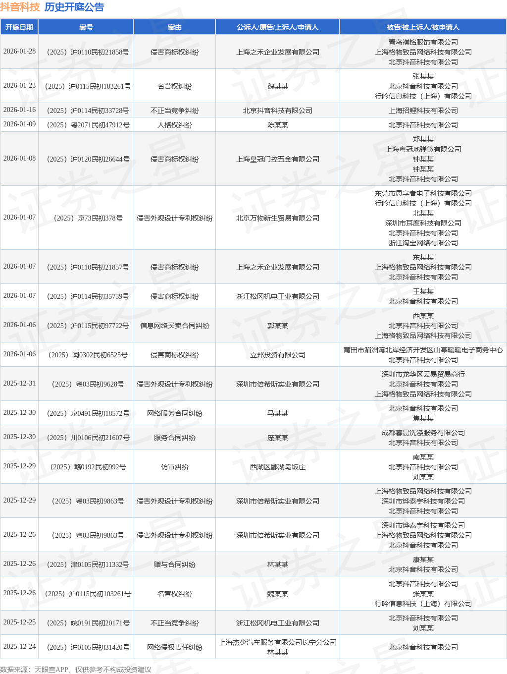 案号:(2025)沪0115民初95610号根据统计,近一年内以北京抖音科技有限公司为当事人的历史开庭公告有1638则,其中案由为“侵害外观设计专利权纠纷”的公告以207则居首,其次为“侵害作品信息网络传播权纠纷”有167则,“侵害商标权纠纷”有167则。历史开庭公告(前20条)如下: