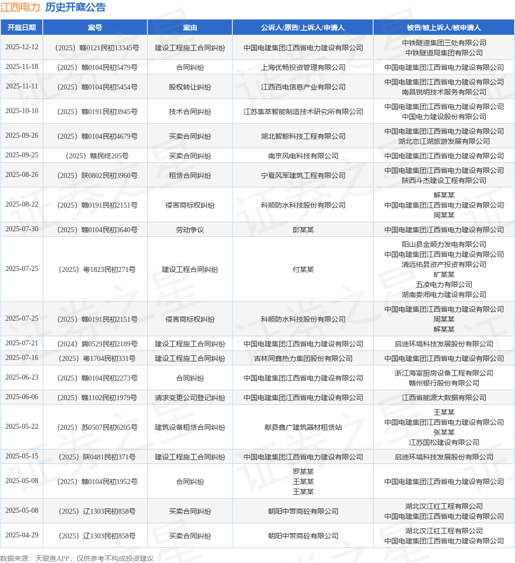 案号:(2025)赣0104民初5479号根据统计,近一年内以中国电建集团江西省电力建设有限公司为当事人的历史开庭公告有37则,其中案由为“建设工程施工合同纠纷”的公告以8则居首,其次为“合同纠纷”有7则,“买卖合同纠纷”有6则。历史开庭公告(前20条)如下: