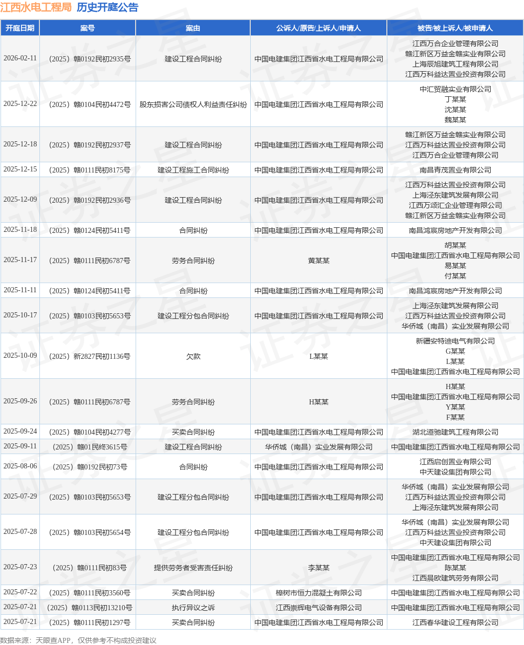 证券之星消息,根据天眼查APP显示,近日公布了一则中国电建集团江西省水电工程局有限公司作为原告/上诉人的开庭公告,详细内容如下: