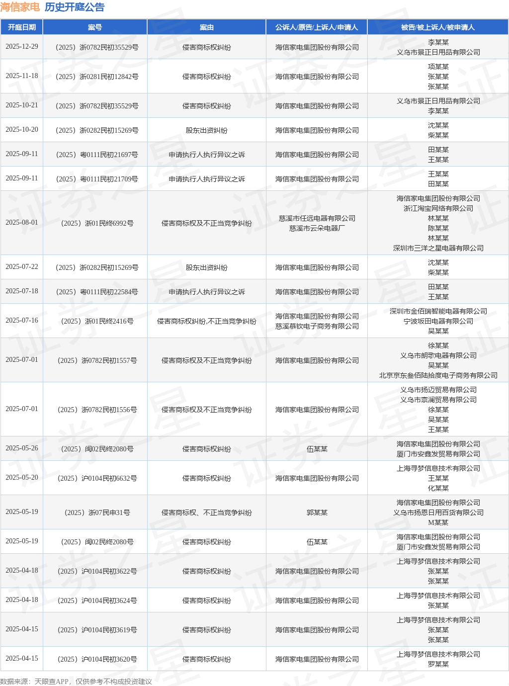 案号:(2025)浙0281民初12842号根据统计,近一年内以海信家电集团股份有限公司为当事人的历史开庭公告有36则,其中案由为“侵害商标权纠纷”的公告以20则居首,其次为“不正当竞争纠纷”有3则,“侵害商标权及不正当竞争纠纷”有3则。历史开庭公告(前20条)如下: