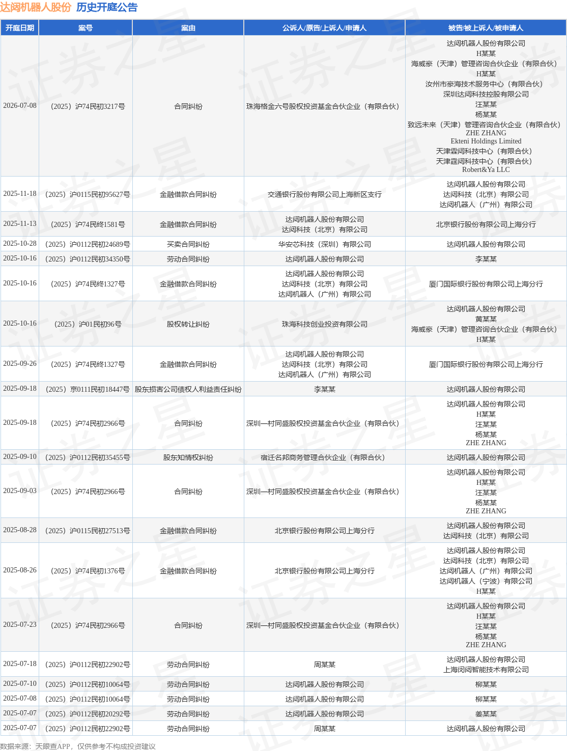 案号:(2025)沪0115民初95627号根据统计,近一年内以达闼机器人股份有限公司为当事人的历史开庭公告有38则,其中案由为“劳动合同纠纷”的公告以16则居首,其次为“金融借款合同纠纷”有9则,“合同纠纷”有4则。历史开庭公告(前20条)如下: