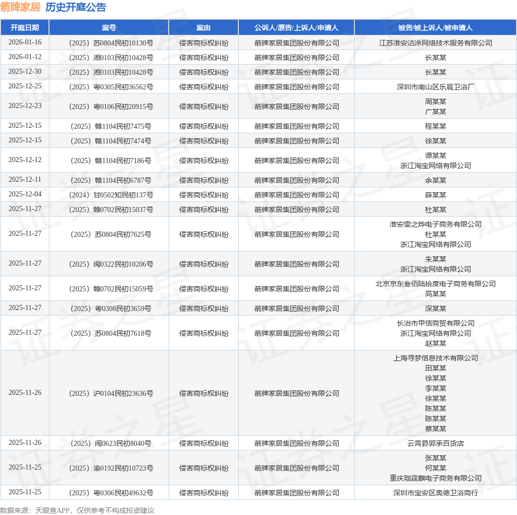 案号:(2025)闽0702民初7085号根据统计,近一年内以箭牌家居集团股份有限公司为当事人的历史开庭公告有496则,其中案由为“侵害商标权纠纷”的公告以434则居首,其次为“商标权权属、侵权纠纷”有20则,“不正当竞争纠纷”有8则。历史开庭公告(前20条)如下: