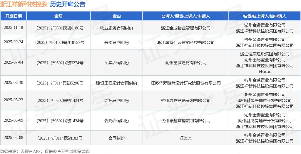 案号:(2025)浙0591民初6186号根据统计,近一年内以浙江祥新科技控股集团有限公司为当事人的历史开庭公告有7则,其中案由为“买卖合同纠纷”的公告以2则居首,其次为“委托合同纠纷”有2则,“合同纠纷”有1则。历史开庭公告如下: