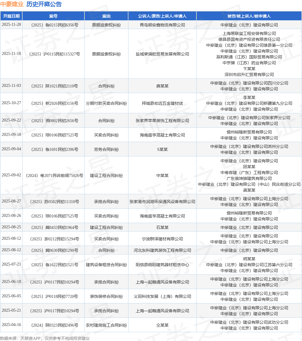 案号:(2025)沪0115民初115327号根据统计,近一年内以中豪建业(北京)建设有限公司为当事人的历史开庭公告有18则,其中案由为“买卖合同纠纷”的公告以3则居首,其次为“合同纠纷”有3则,“承揽合同纠纷”有3则。历史开庭公告如下: