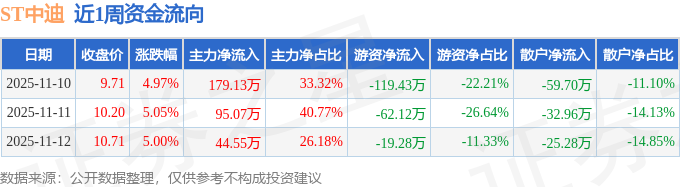 资金流向数据方面,本周ST中迪主力资金合计净流入318.76万元,游资资金合计净流出200.83万元,散户资金合计净流出117.93万元。本周资金流向一览见下表: