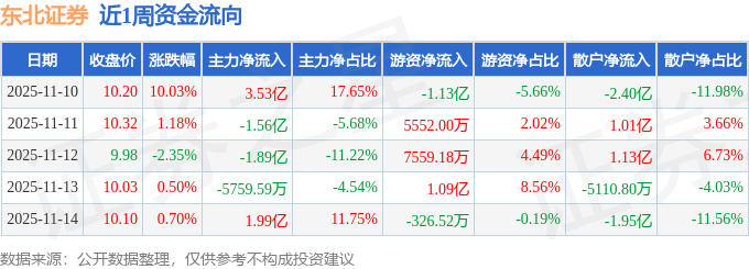 资金流向数据方面,本周东北证券主力资金合计净流入1.49亿元,游资资金合计净流入1.23亿元,散户资金合计净流出2.72亿元。本周资金流向一览见下表: