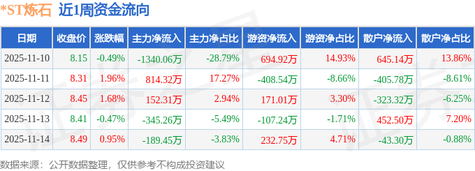 资金流向数据方面,本周*ST炼石主力资金合计净流出908.14万元,游资资金合计净流入582.9万元,散户资金合计净流入325.23万元。本周资金流向一览见下表: