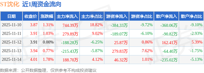 资金流向数据方面,本周ST沈化主力资金合计净流入809.27万元,游资资金合计净流出221.39万元,散户资金合计净流出587.89万元。本周资金流向一览见下表: