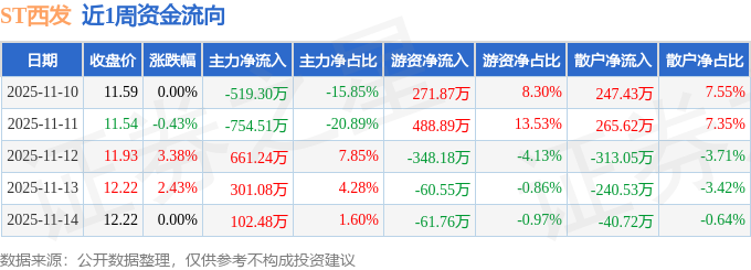 资金流向数据方面,本周ST西发主力资金合计净流出209.01万元,游资资金合计净流入290.26万元,散户资金合计净流出81.25万元。本周资金流向一览见下表: