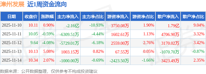 资金流向数据方面,本周漳州发展主力资金合计净流出3.37亿元,游资资金合计净流入5555.74万元,散户资金合计净流入2.81亿元。本周资金流向一览见下表: