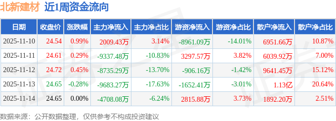 资金流向数据方面,本周北新建材主力资金合计净流出3.05亿元,游资资金合计净流出5406.21万元,散户资金合计净流入3.59亿元。本周资金流向一览见下表: