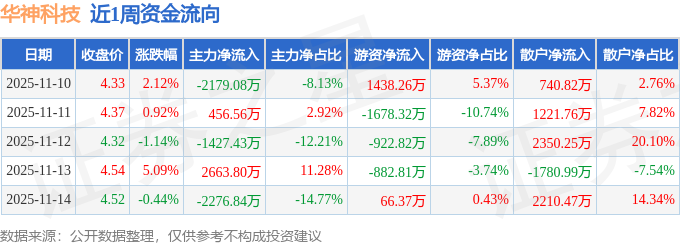 资金流向数据方面,本周华神科技主力资金合计净流出2762.98万元,游资资金合计净流出1979.32万元,散户资金合计净流入4742.3万元。本周资金流向一览见下表: