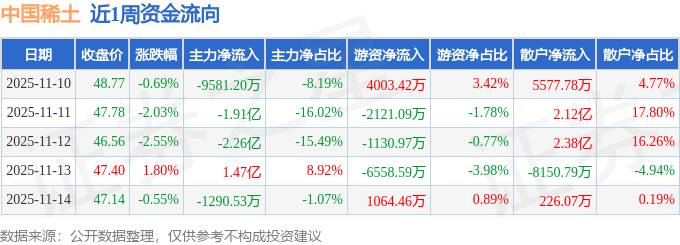 资金流向数据方面,本周中国稀土主力资金合计净流出3.79亿元,游资资金合计净流出4742.77万元,散户资金合计净流入4.26亿元。本周资金流向一览见下表: