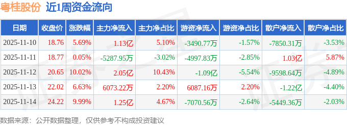资金流向数据方面,本周粤桂股份主力资金合计净流入4.51亿元,游资资金合计净流出2.04亿元,散户资金合计净流出2.48亿元。本周资金流向一览见下表: