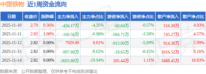 资金流向数据方面,本周中国铁物主力资金合计净流出5307.7万元,游资资金合计净流出1373.05万元,散户资金合计净流入6680.74万元。本周资金流向一览见下表: