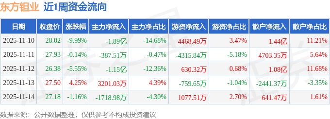 资金流向数据方面,本周东方钽业主力资金合计净流出2.93亿元,游资资金合计净流入1100.82万元,散户资金合计净流入2.82亿元。本周资金流向一览见下表: