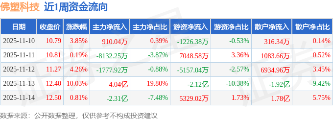 资金流向数据方面,本周佛塑科技主力资金合计净流入8313.37万元,游资资金合计净流出1.52亿元,散户资金合计净流入6873.26万元。本周资金流向一览见下表: