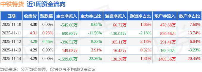 资金流向数据方面,本周中铁特货主力资金合计净流出3083.53万元,游资资金合计净流入188.51万元,散户资金合计净流入2895.01万元。本周资金流向一览见下表: