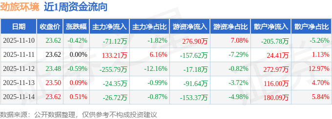 资金流向数据方面,本周劲旅环境主力资金合计净流出244.77万元,游资资金合计净流出142.92万元,散户资金合计净流入387.69万元。本周资金流向一览见下表: