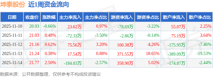 资金流向数据方面,本周坤泰股份主力资金合计净流出139.63万元,游资资金合计净流入749.28万元,散户资金合计净流出609.66万元。本周资金流向一览见下表: