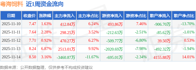 资金流向数据方面,本周粤海饲料主力资金合计净流入233.5万元,游资资金合计净流出2944.24万元,散户资金合计净流入2710.75万元。本周资金流向一览见下表: