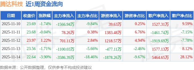 资金流向数据方面,本周腾达科技主力资金合计净流出5473.99万元,游资资金合计净流入286.31万元,散户资金合计净流入5187.67万元。本周资金流向一览见下表: