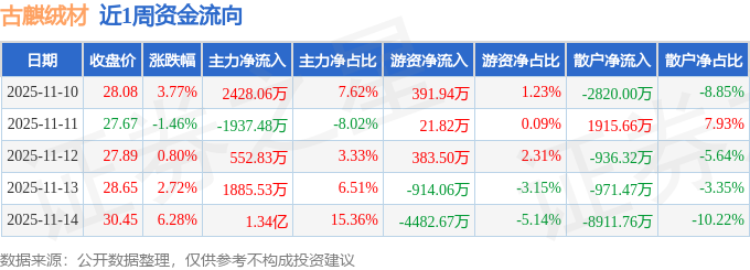 资金流向数据方面,本周古麒绒材主力资金合计净流入1.63亿元,游资资金合计净流出4599.46万元,散户资金合计净流出1.17亿元。本周资金流向一览见下表: